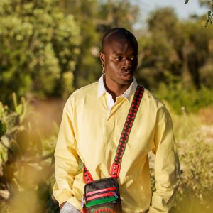 [split] Travel light & efficient with this durable yet stylish cross-body waist bag. Perfect for your phone, wallet, sunglasses, keys and other small items. PRODUCT DETAILS Exterior Dimensions: 7″ x 1.5″ x 15″ • Adjustable double-sided VSM strap for custom sizing • Red zippered pocket with metal buckle hardware Fabric 100% Faux Leather