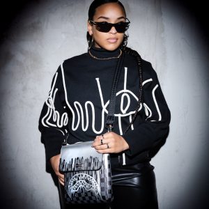 [split] Travel light & efficient with this durable yet stylish large sling.  PRODUCT DETAILS 1/2 Quilted  & 1/2 Printed PVC with Cut & Sewn shark mouth details and matte black hardware  100% FAUX LEATHER Exterior H 9” x W 8.5” x D 2” Adjustable Cross Body Strap Zipper closure Interior zipped pocket 100% PVC Fabric…