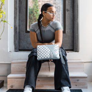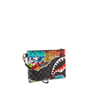 [split] AFRICAN INTELLIGENCE A.i. SANDFLOWER X SPRAYGROUND COLLABORATION. A Portion of the Proceeds from this Collaboration will go to Global Humanitarian Aid and Conservation Programs 100% FAUX LEATHER Convertible Clutch “Pouchette” Pouch with removable wristlet strap, Handle on front panel, Zip Closure, secret stash pocket on side seam1 interior pocket7″ X 10″ X 0.25″