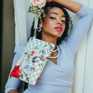 [split] 100% FAUX LEATHER Faux leather printed in a brightly colored custom bandana pattern.   Convertible Clutch “Pouchette” Pouch with removable wristlet strap, Handle on front panel, Zip Closure1 interior pocket7″ X 10″ X 0.25″