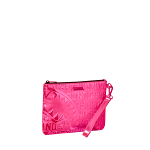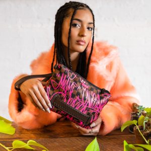 [split] Plush faux fur fabric printed with iconic sprayground graffiti  Convertible Clutch “Pouchette” Pouch with removable wristlet strap, Handle on front panel, Zip Closure1 interior pocket7″ X 10″ X 0.25″