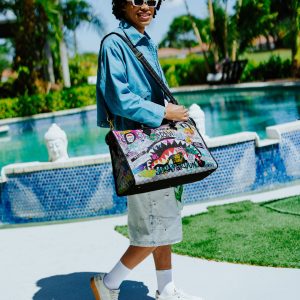 [split] PRODUCT DETAILS Sporty neoprene fabric embossed with custom Sprayground logo pattern. The styles are trimmed with matching faux leather trims and elevated with gold chain accents and gold hardware The fabric is 100% polyester neoprene which is lightweight and soft to the touch Dimensions: 8″ x 7.5″ x 13″• Metal zipper pocket• Back Zippers •Zippered…