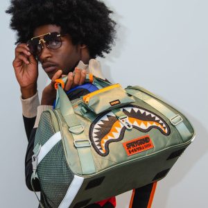 [split] PRODUCT DETAILS Removable Mini Bags for additional stash capabilities! Exterior: Dimensions: W 17” x H 10” x D 8.5” • Double zipper opening • Top handle • Removable side handle • Zippered Stash pocket • Padded shoulder strap • Non-skid feet • Quick access opening • Mesh ventilation Tether: Internal safety tether Tether should not be worn during travel Only…