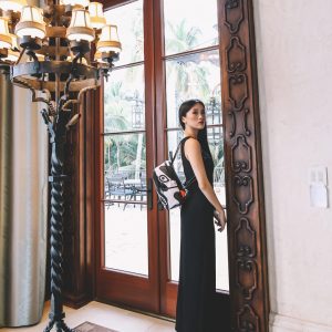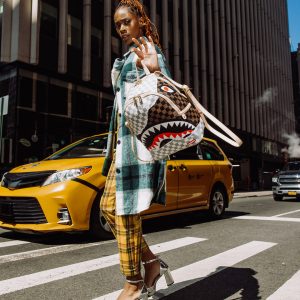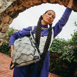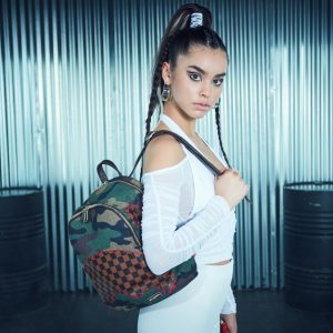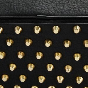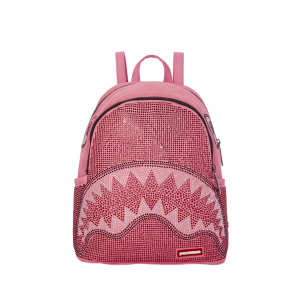[split] PRODUCT DETAILS Crystal Embellishment Exterior Dimensions: 10″ x 5″ x 11.5″ • Two large main zippered compartments • Side pockets • Zippered Stash pocket • Adjustable straps for custom sizing • Gold zippers with metal hardware Interior Zippered organizer pocket • Two slip pockets • Key ring clip Fabric Durable Vegan Leather water-resistant fabric
