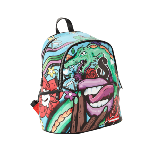 [split] Exterior Dimensions: 10″ x 5″ x 11.5″ • Two large main zippered compartments • Side pockets • Zippered Stash pocket • Adjustable straps for custom sizing • Gold zippers with metal hardware Interior Zippered organizer pocket • Two slip pockets • Key ring clip Fabric Durable Vegan Leather water-resistant fabric