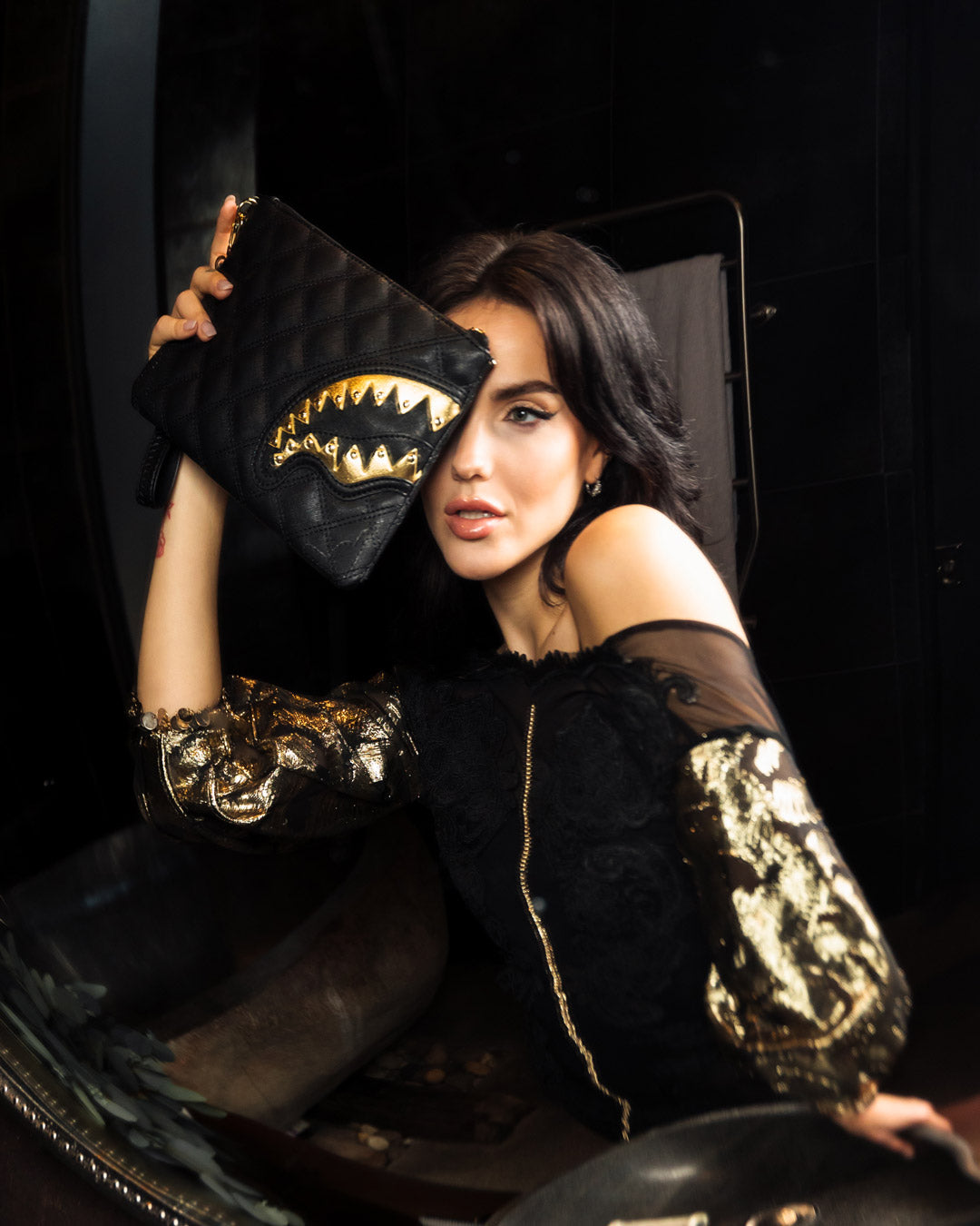 Sophisticated quilted faux leather collection. Accented with metallic gold shark mouths and nail head hardware details.