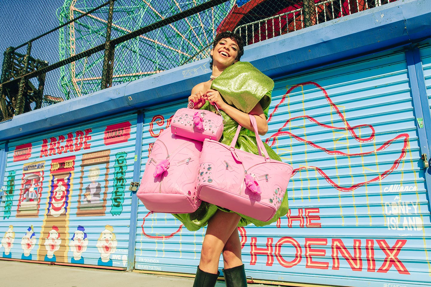 Cut and sew sharkmouth with metal studs detailing, silver turnlock, removable adjustable strap, handle with silver metal ‘S/G’ logo details, 1 interior zipper, plush bear