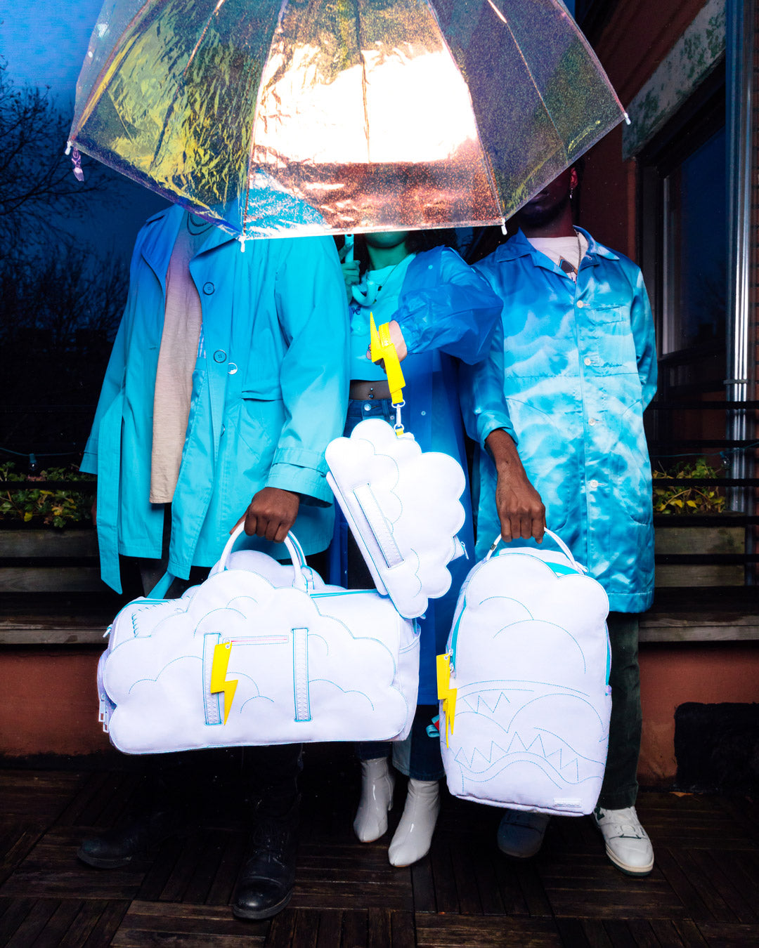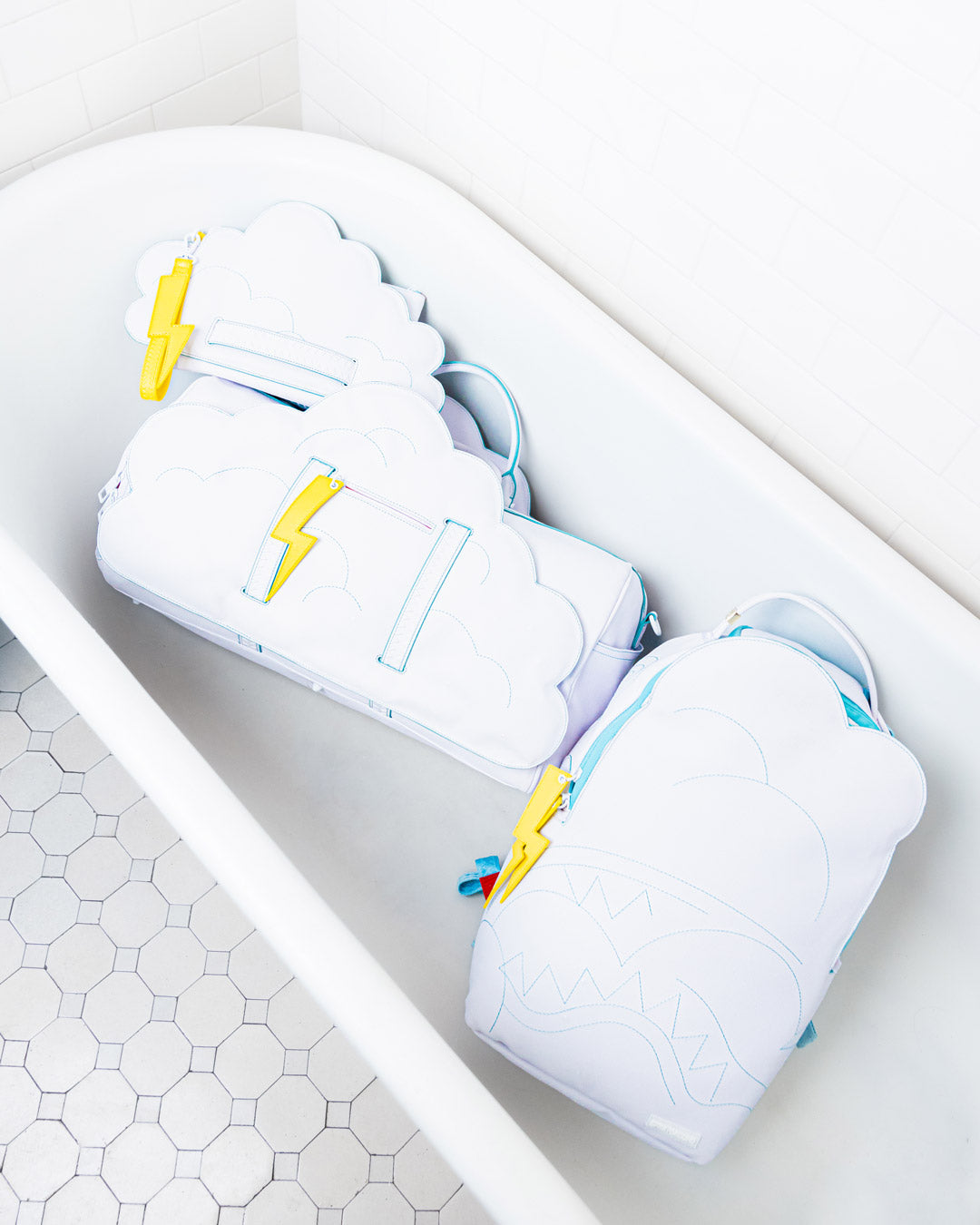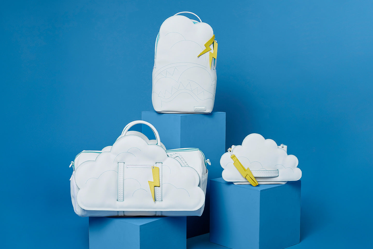A fun quirky capsule with dye cut clouds and lightning bolts in classic Sprayground silhouettes.