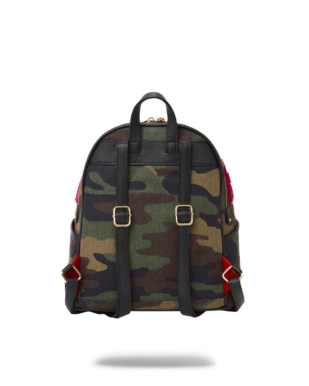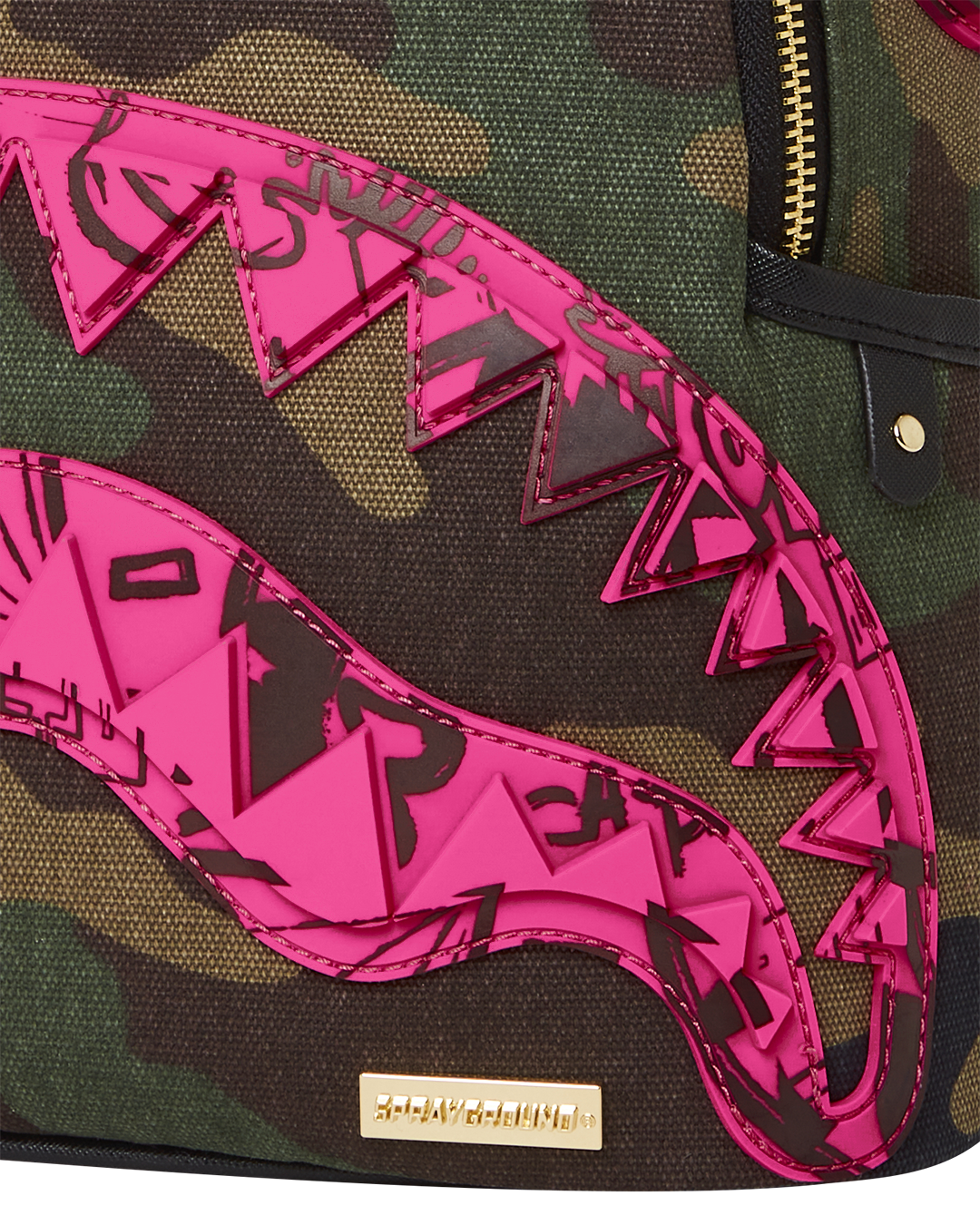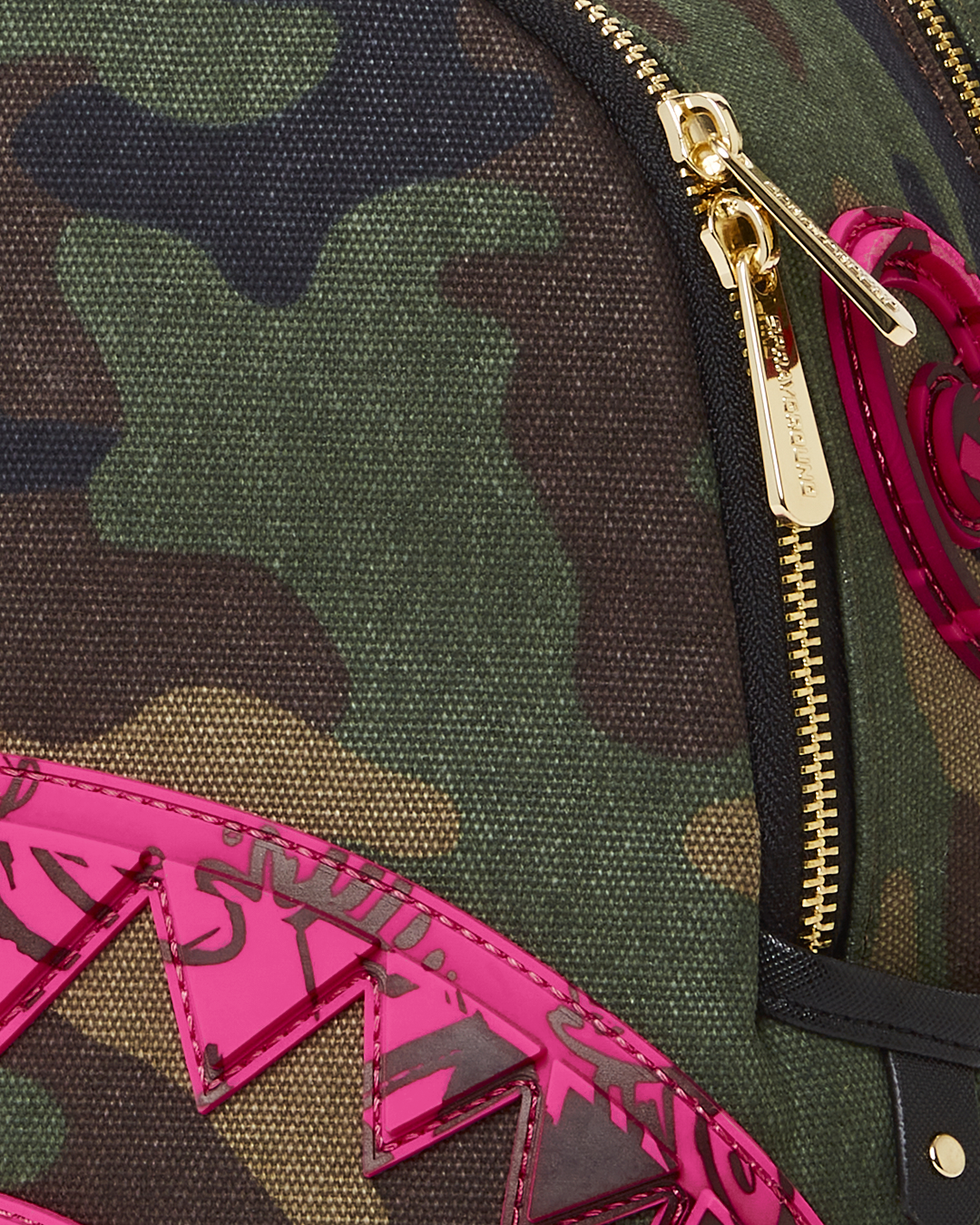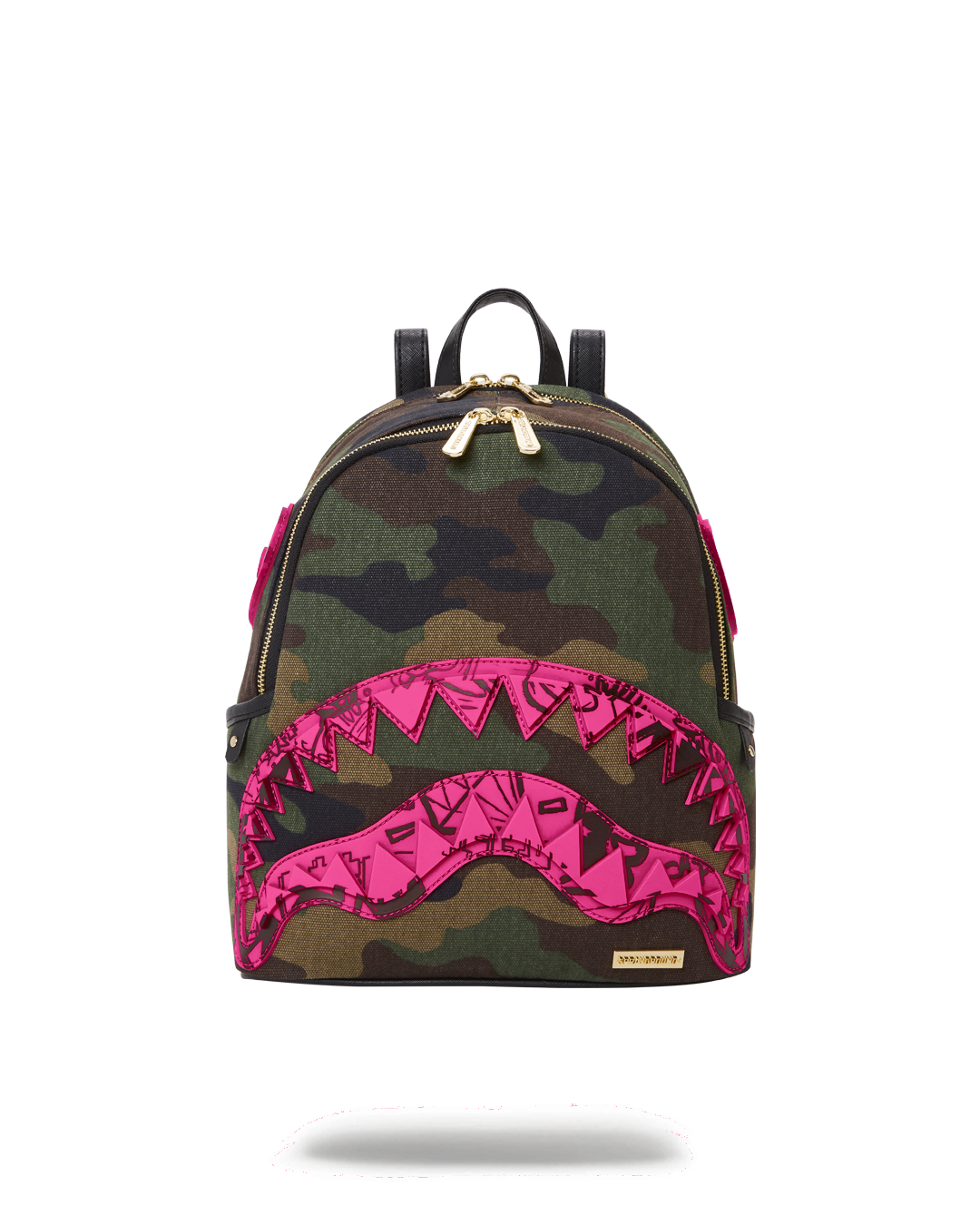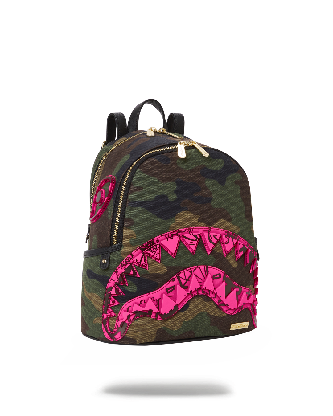 Dimensions: 10″ x 5″ x 11.5″ • Rubber Shark Mouth Two large main zippered compartments • Side pockets • Zippered Stash pocket • Adjustable straps for custom sizing • Gold zippers with metal hardware