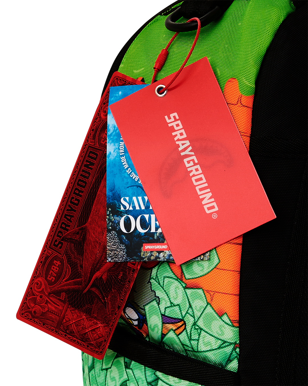 Dimensions: 18″ x 6″ x 11.5″ • Front zipper pocket • Side pockets • Zippered Stash pocket • Separate velour sunglass compartment • Ergonomic mesh back padding • Adjustable Straps for custom sizing • Gold zippers with metal hardware • Metal “Sprayground Authentic” badge • Slide through back sleeve connects to carry-on luggage to free your hands