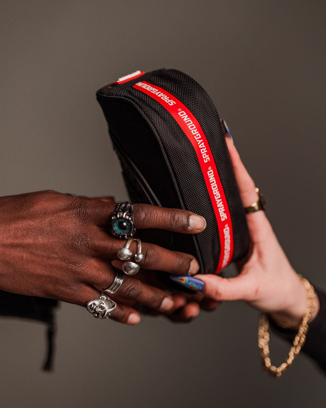 Ballistic polyester with SPRAYGROUND printed zipper tape and a rubber sharkmouth.