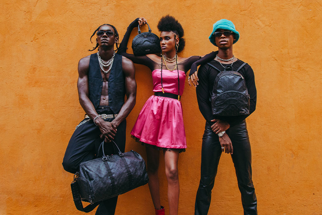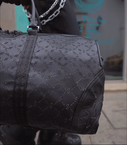100% PVC with exclusive laser cut money logo pattern applied over metallic iridescent fabric to give a touch of shimmer to the fabric