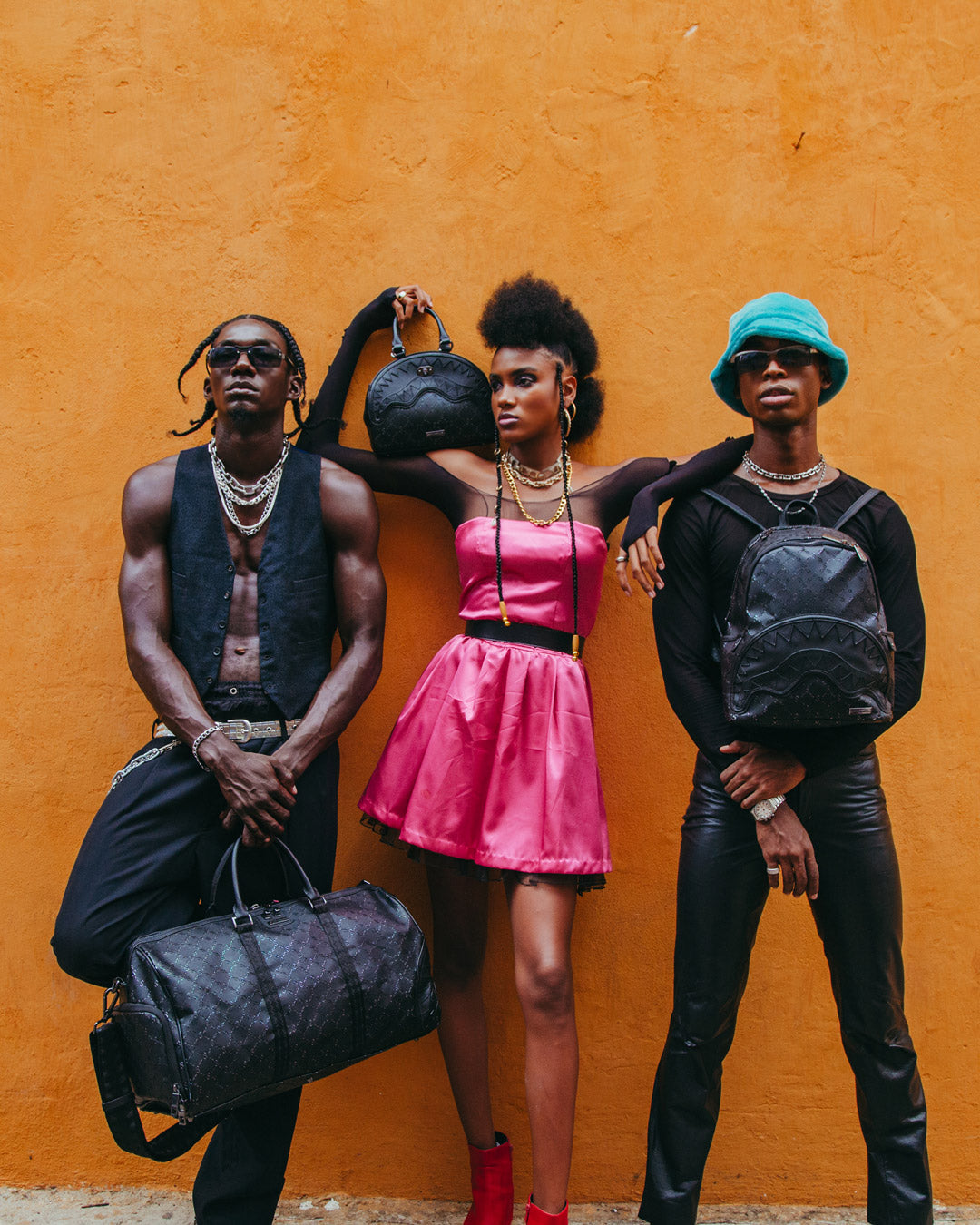 100% PVC with exclusive laser cut money logo pattern applied over metallic iridescent fabric to give a touch of shimmer to the fabric