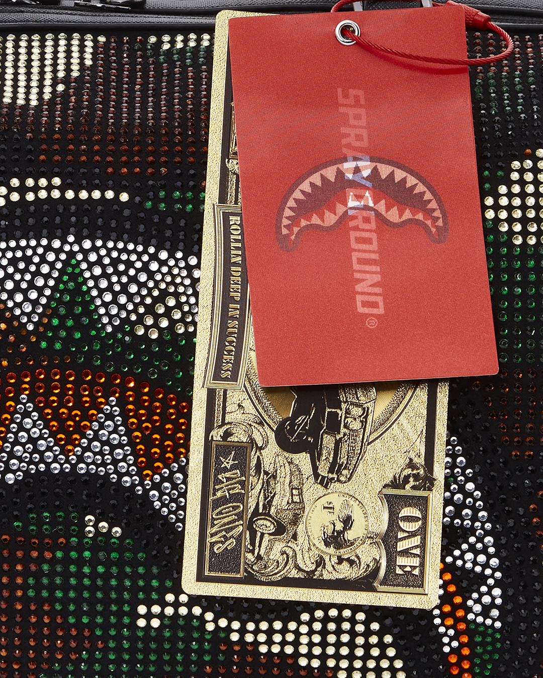 Dimensions: 8″ x 7.5″ x 13″ • Metal zipper pocket• Back Zippers •Zippered sneaker pocket • gold zippers • Adjustable Straps for custom sizing •Metal Zippers with Metal Hardware • bag of Sprayground money