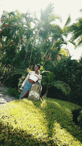 100% Cotton green army canvas over custom printed PVC leather mouth with fringe details Features an exterior cargo pocket & a vertical zipper pocket
