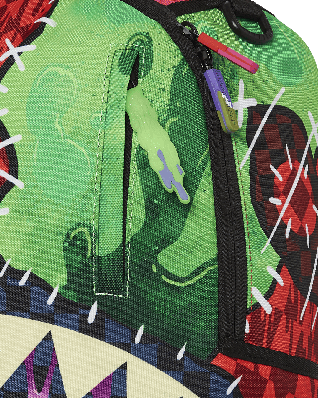 Dimensions: 18″ x 6″ x 11.5″ • Front zipper pocket • Side pockets • Zippered Stash pocket • Separate velour sunglass compartment • Ergonomic mesh back padding • Adjustable Straps for custom sizing • Gold zippers with metal hardware • Metal “Sprayground Authentic” badge • Slide through back sleeve connects to carry-on luggage to free your hands